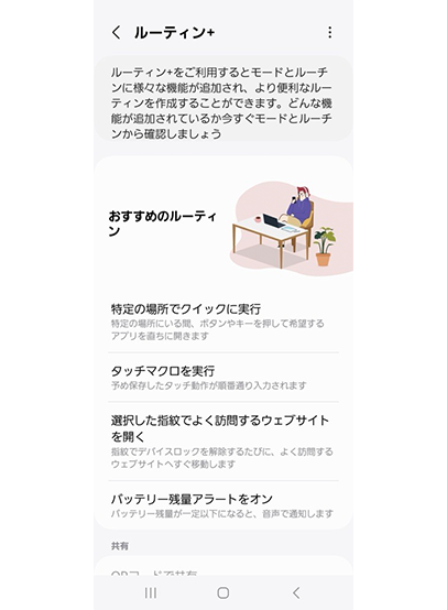 Routines+は上記の既存の「モードとルーチン」にさらに条件や実行内容を追加することができます。他にもQRコードで自分のルーチンを他の人に共有することもできるので、周りにGalaxyスマホを使用している人がいる方はぜひお互いにシェアして、便利なルーチンを探し出すのもいいですね。