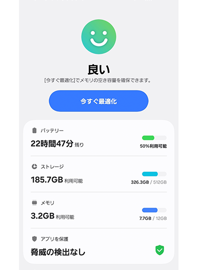 この機能はROMやRAMの状態を常にチェックし、自動的にスマホを最適化してくれます。簡単な操作でキャッシュなどの不要なデータを削除したり、未使用または裏側で稼働するアプリを終了したりできるので、設定に慣れていない人にとっては非常に便利です。