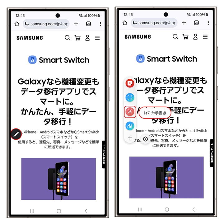 Sペン対応のSamsung Galaxyスマートフォンでは、スクロールキャプチャがSペンでも操作できます。端末からSペンを抜き(Sペンをすでに抜いている場合には、Sペンのボタンを押す)エアコマンドを起動 →「キャプチャ手書き」をタップして、画面下部に表示されるスクロールキャプチャをタップしてください。長いテキストなどをキャプチャした画像に、Sペンで書き込むことも可能です。