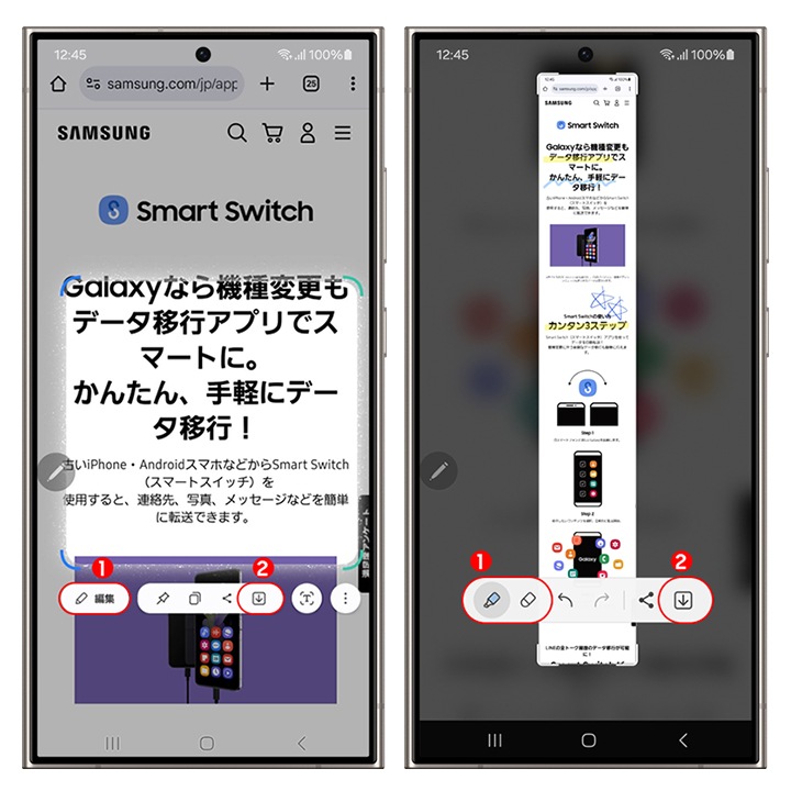 Samsung Galaxyのスマートフォン(一部の製品を除く)では、長い記事などをひとつのスクショ画像として保存することもできます。画面がキャプチャされると、そのプレビューと同時にいくつかの操作オプションが表示されます。該当ボタンのタップを繰り返すか、もしくは長押しすることで長いページの内容も1枚のスクショイメージとして保存が可能です。