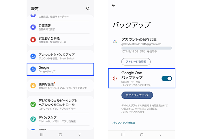 2. [バックアップ] をタップし、[Google Oneへのバックアップ] をオンにする