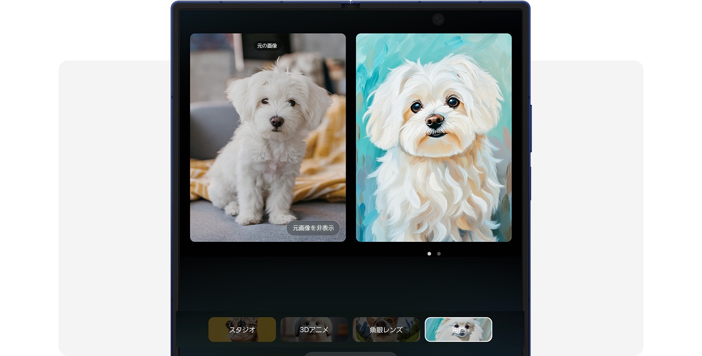写真編集にちょっとだけ、想像力を働かせましょう。人物写真だけでなく、ペットの写真もポートレートスタジオに簡単に変換できるようになりました(人物とペットでは使用可能なエフェクトが異なります)。オリジナルとAIの結果を並べて表示し、その変化を大画面で一目で確認できます。AIに任せるだけで、とても簡単です。7,8
