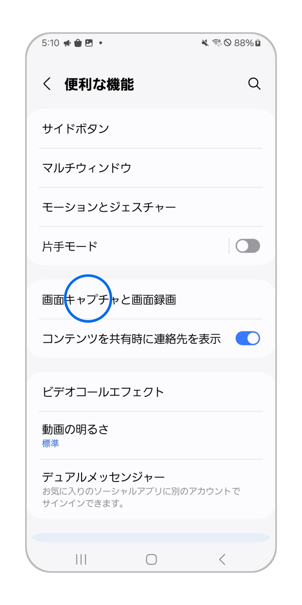 スワイプキャプチャとは、画面に手の側面(小指側の側面)を軽く触れさせた状態で右から左(または左から右)へ軽くなぞる(画面を拭くような動作)ことで画面キャプチャが撮影できる機能です。