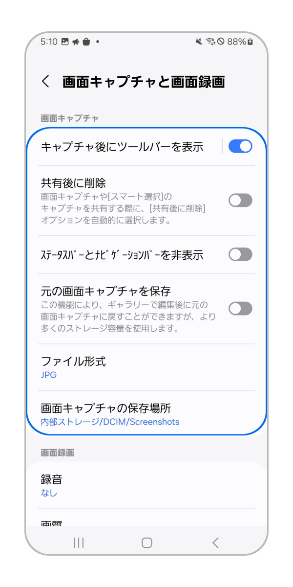 画面キャプチャの保存場所:マイファイル内にあるフォルダに保存先を変更することが可能です。