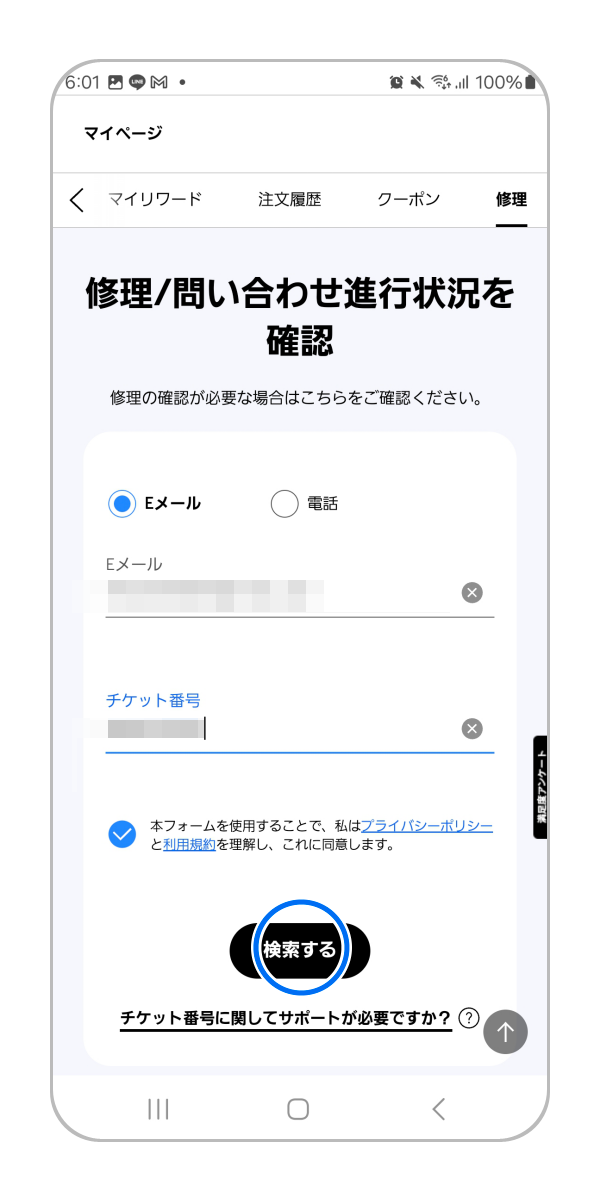 ただし、申し込んだ際の【Eメール(または電話番号)】と【チケット番号】がわからない場合は一度ログインした状態で情報を確認してください。