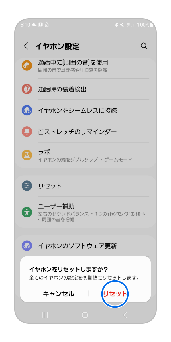 設定 > イヤホン名 > 接続を管理 > リセット > リセット