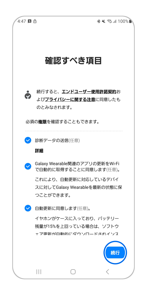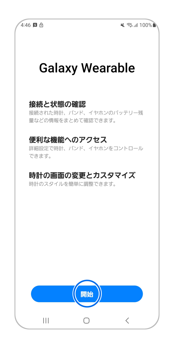 - Galaxy Wearable アプリの機能を最大限に利用するためには権限についてのポップアップが表示された場合、「許可」を選択してください。
