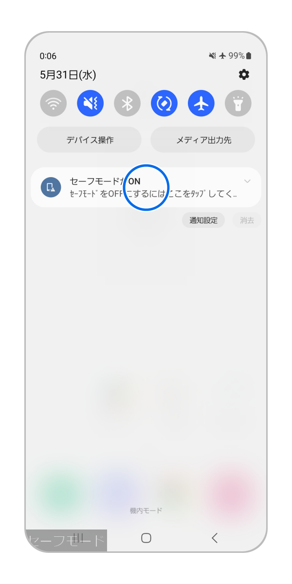 - Android バージョンによってはセーフモード解除後、機内モードになっているため、機内モードを解除してください。