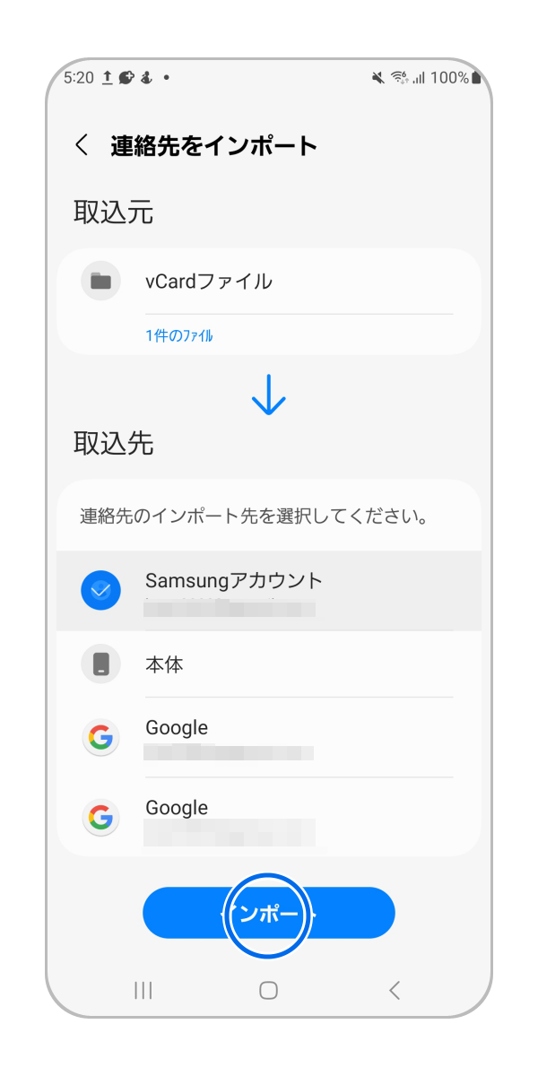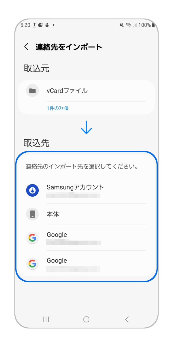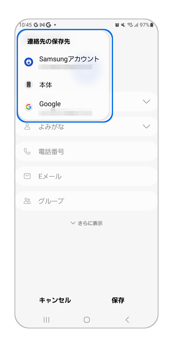 Samsungアカウント、Googleアカウントにサインイン済みの場合、それぞれのアカウント情報が表示されます。