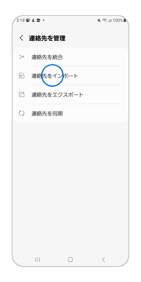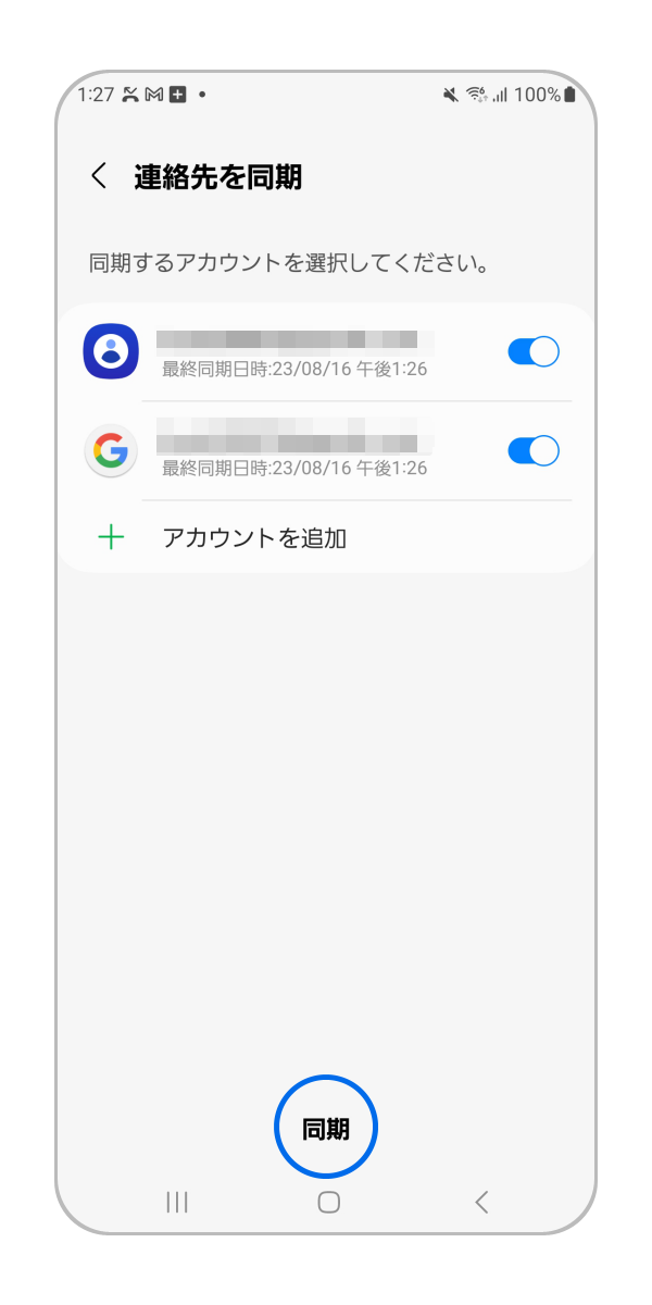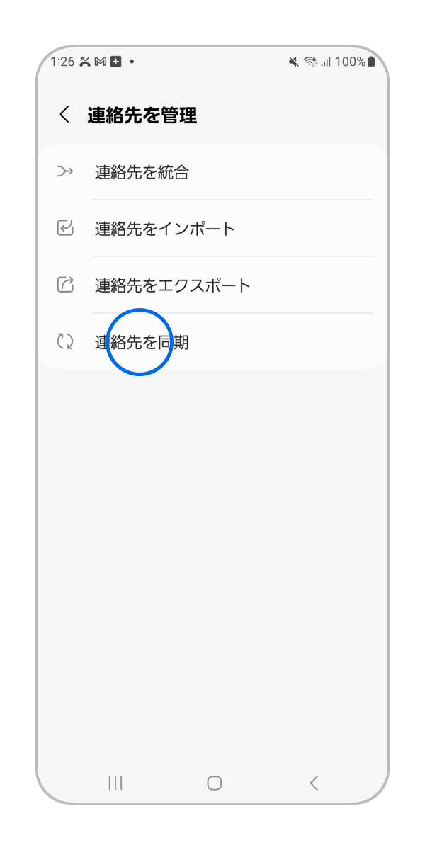- Android 15 端末の場合、右上縦3点 > 設定 > 「連絡先のアカウントを同期」で同期することができます。