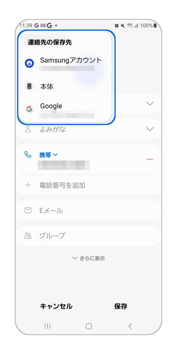 保存先が別で連絡先が重複している場合、保存先が複数表示される場合があります。