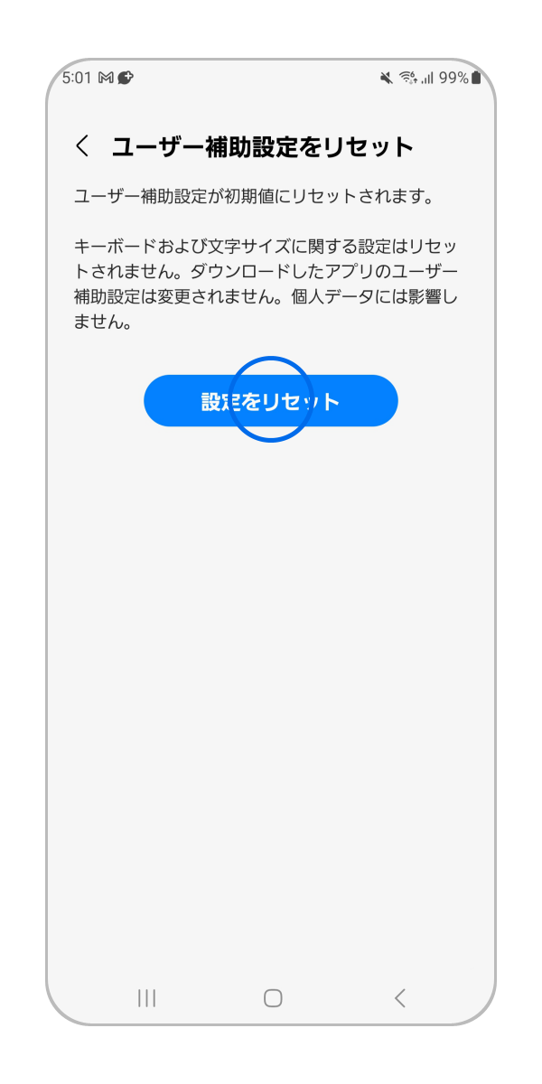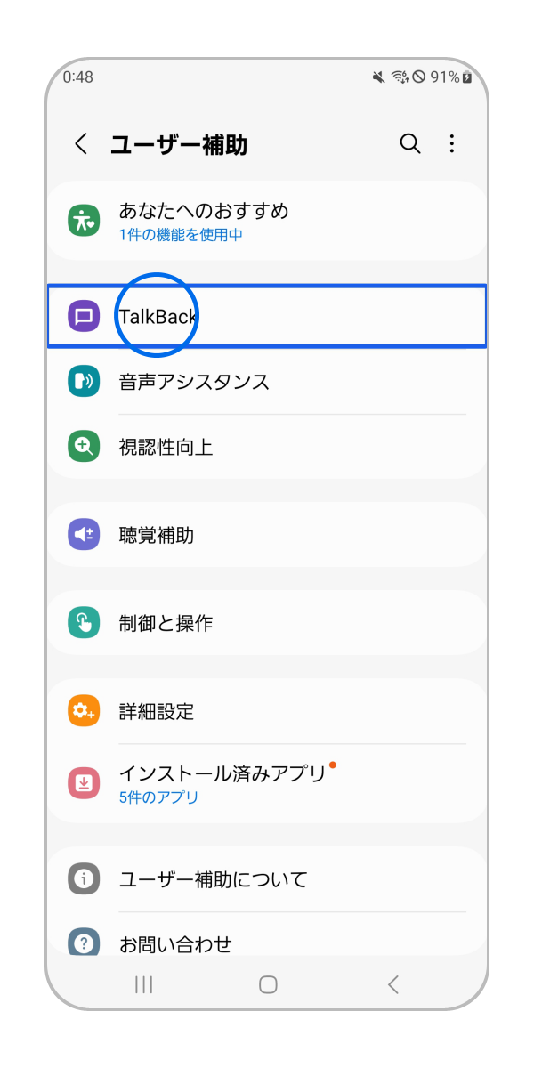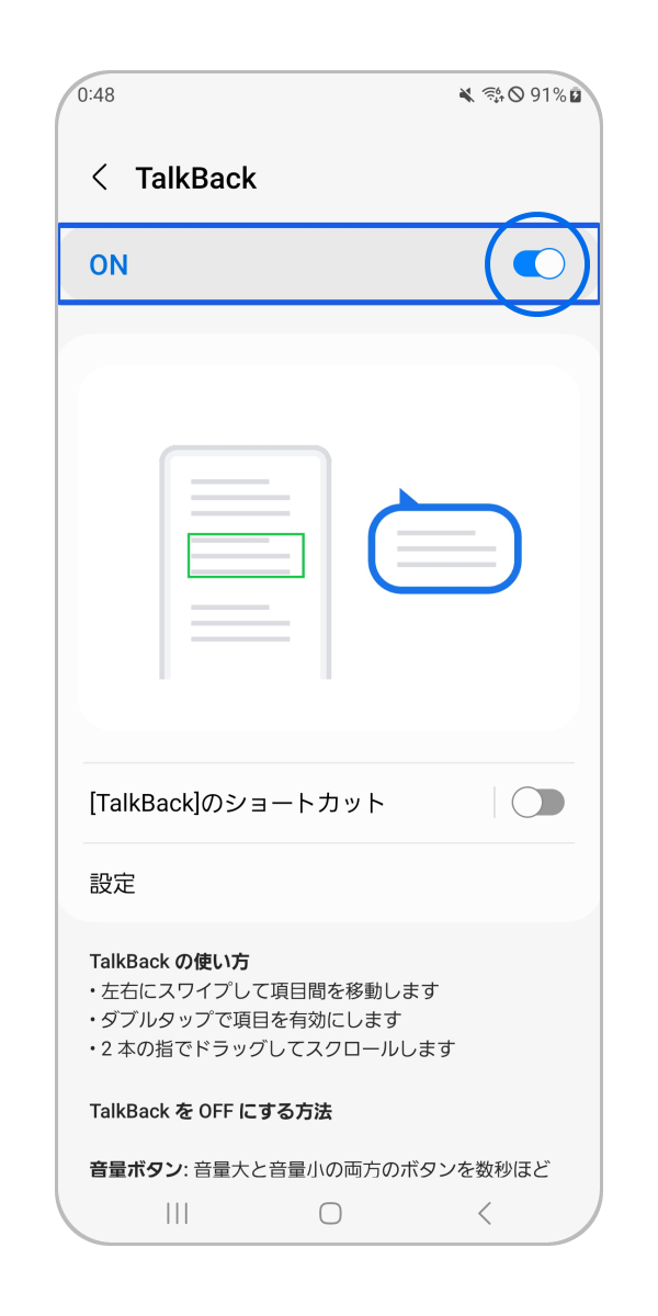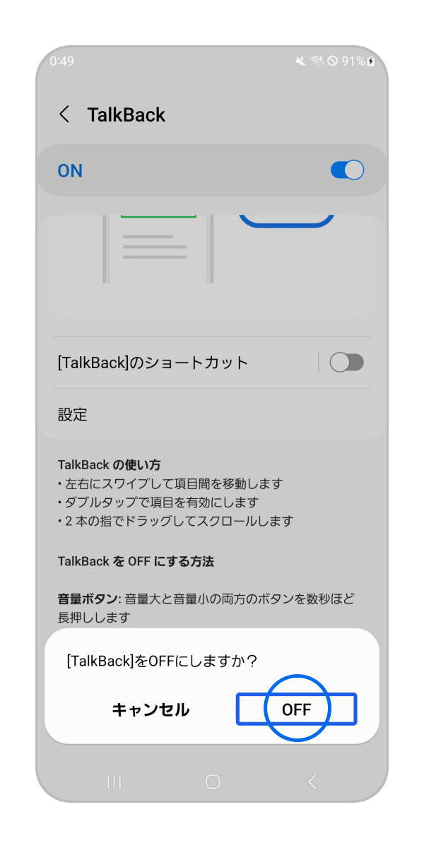 Talk Back が有効になっていて解除するにも操作がわからない場合、その画面にたどり着けない場合があります。