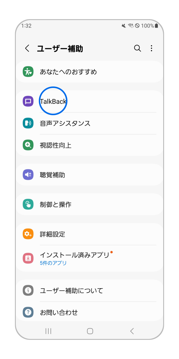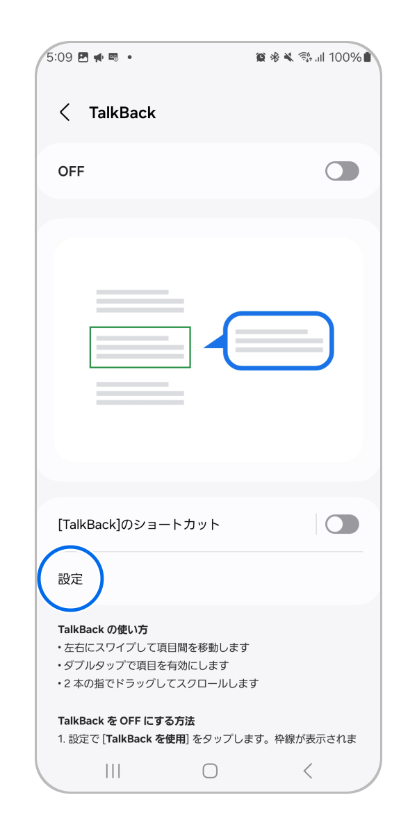 タップした箇所が青い枠で囲われ、音声読み上げをしている場合、Talk Back 機能が有効になっています。