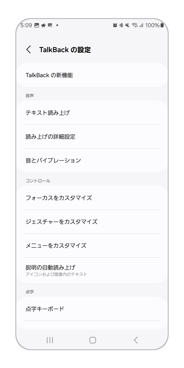 - メニューをカスタマイズ: Talk Back 使用中の操作やメニューを変更します。