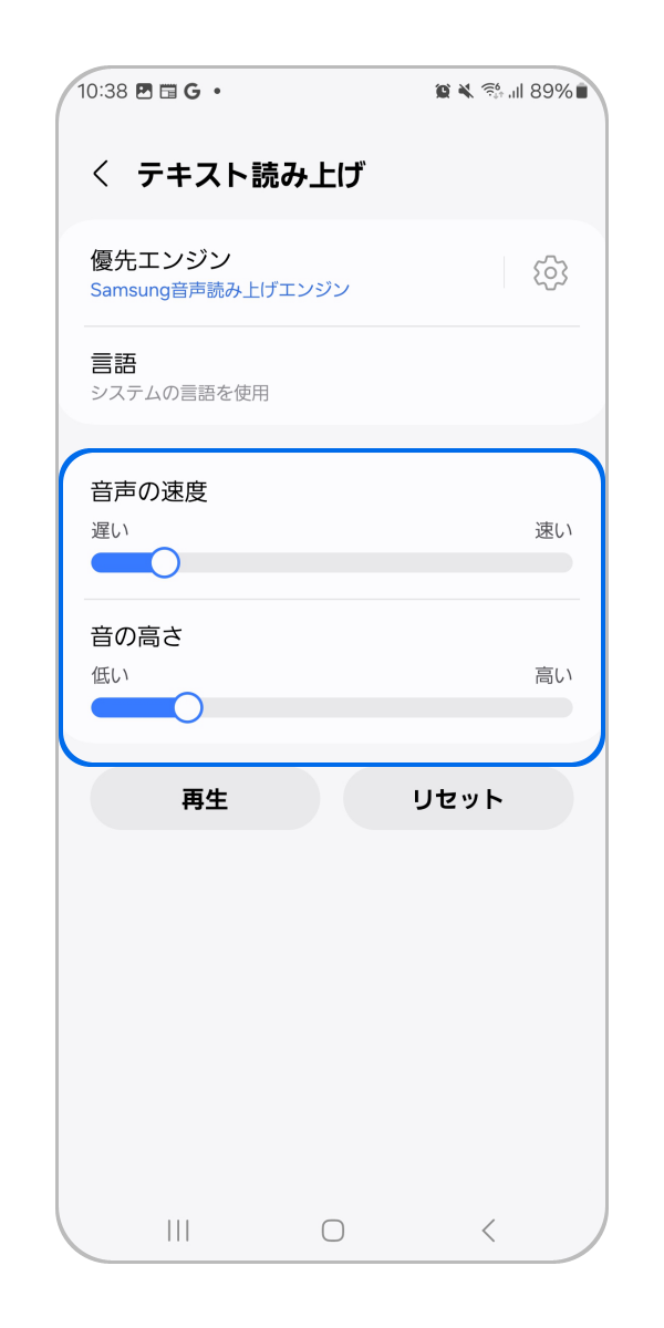 Samsung の音声読み上げエンジンを使用している場合、いくつかの言語や読み上げる速度、音の高低などを設定することができます。
