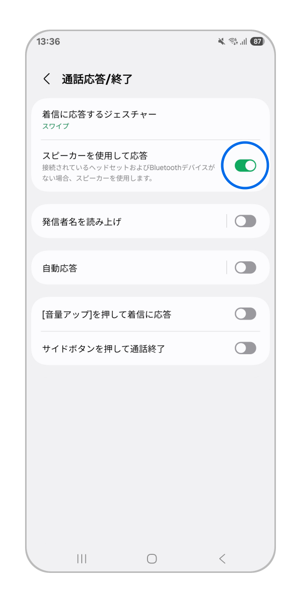 ユーザー補助の設定により、Bluetooth機器に接続していない場合、着信に応答するとスピーカーで着信をとることができます。