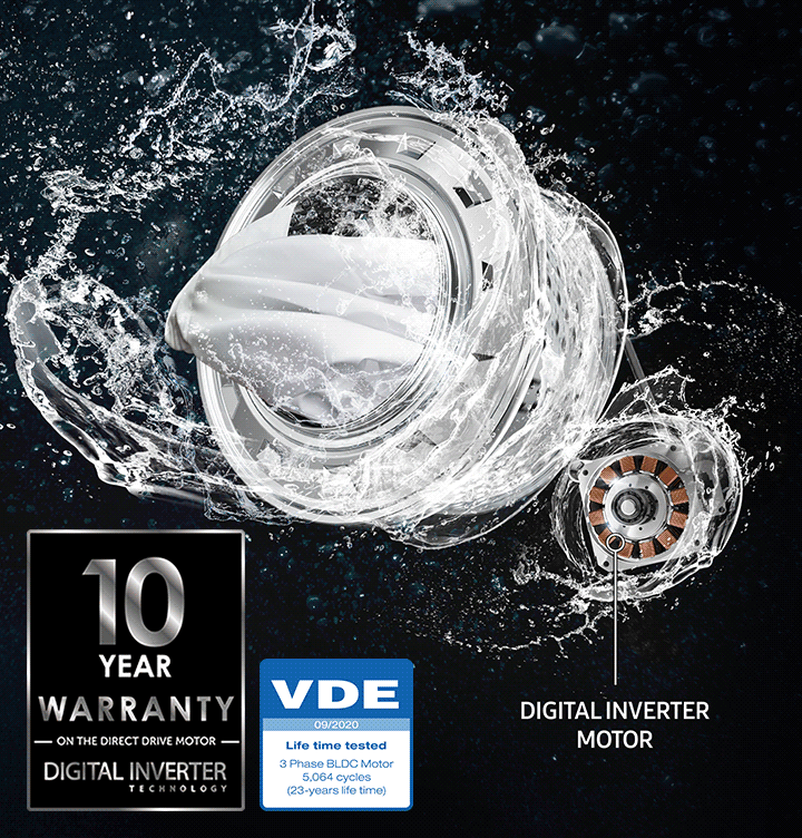 Жоғары қуат тиімділігін, аз шу және ұзақ жұмыс істеу мүмкіндігін пайдаланыңыз. Сандық Инвертор Технологиясында тыныш* және қуатты өнімділік үшін күшті магниттер қолданылады, бірақ әмбебап моторға қарағанда аз энергия тұтынылады. Ол сонымен қатар саладағы ең ұзақ төзімділік** және 10 жылдық кепілдік береді.