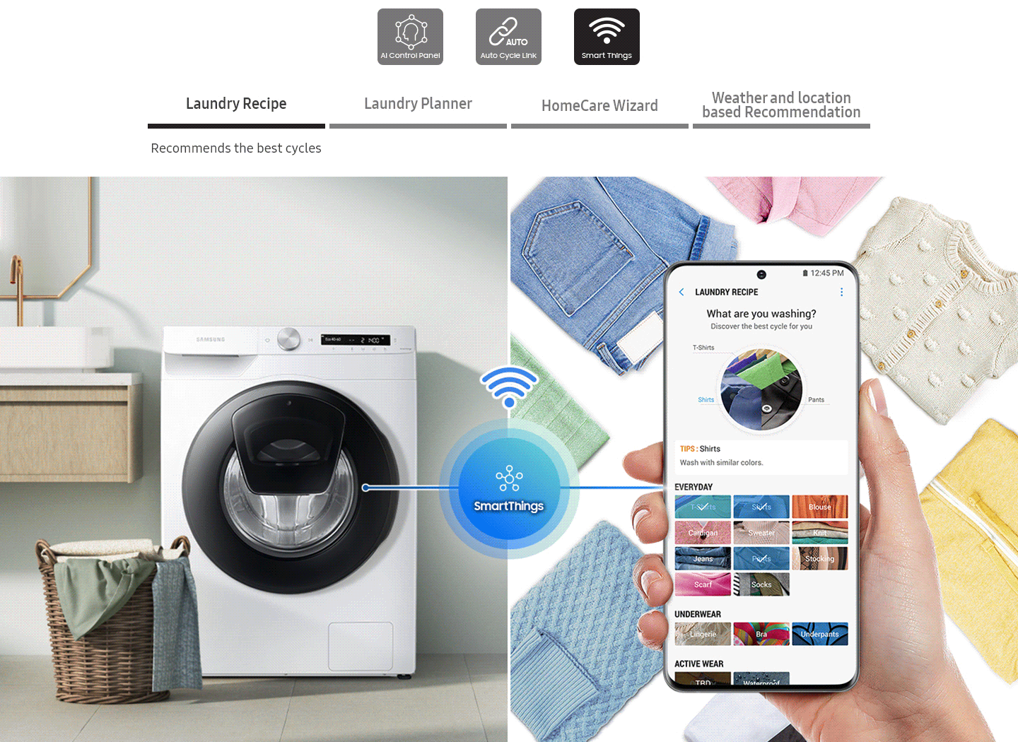 - * Android және iOS құрылғыларында қолжетімді. Wi-Fi қосылымы және Samsung есептік жазбасы қажет.** Auto Cycle Link функциясы кір жуғыш машина мен кептіргіште AI Control және Wi-Fi қосылған жағдайда ғана қолжетімді болады.※Берілген суреттер нақты өнімнен өзгеше болуы мүмкін.※Мобильді графикалық пайдаланушы интерфейсі суреттері ел, қоршаған орта және т.б. аспектілер бойынша әртүрлі болуы мүмкін.