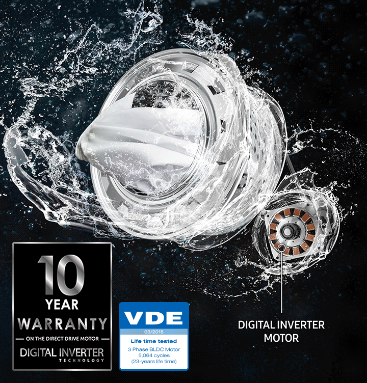 Жоғары қуат тиімділігін, аз шу және ұзақ жұмыс істеу мүмкіндігін пайдаланыңыз. Сандық инвертор технологиясында тыныш* және қуатты өнімділік үшін күшті магниттер қолданылады, бірақ әмбебап моторға қарағанда аз энергия тұтынылады. Ол сонымен қатар саладағы ең ұзақ төзімділік** және 10 жылдық кепілдік береді.