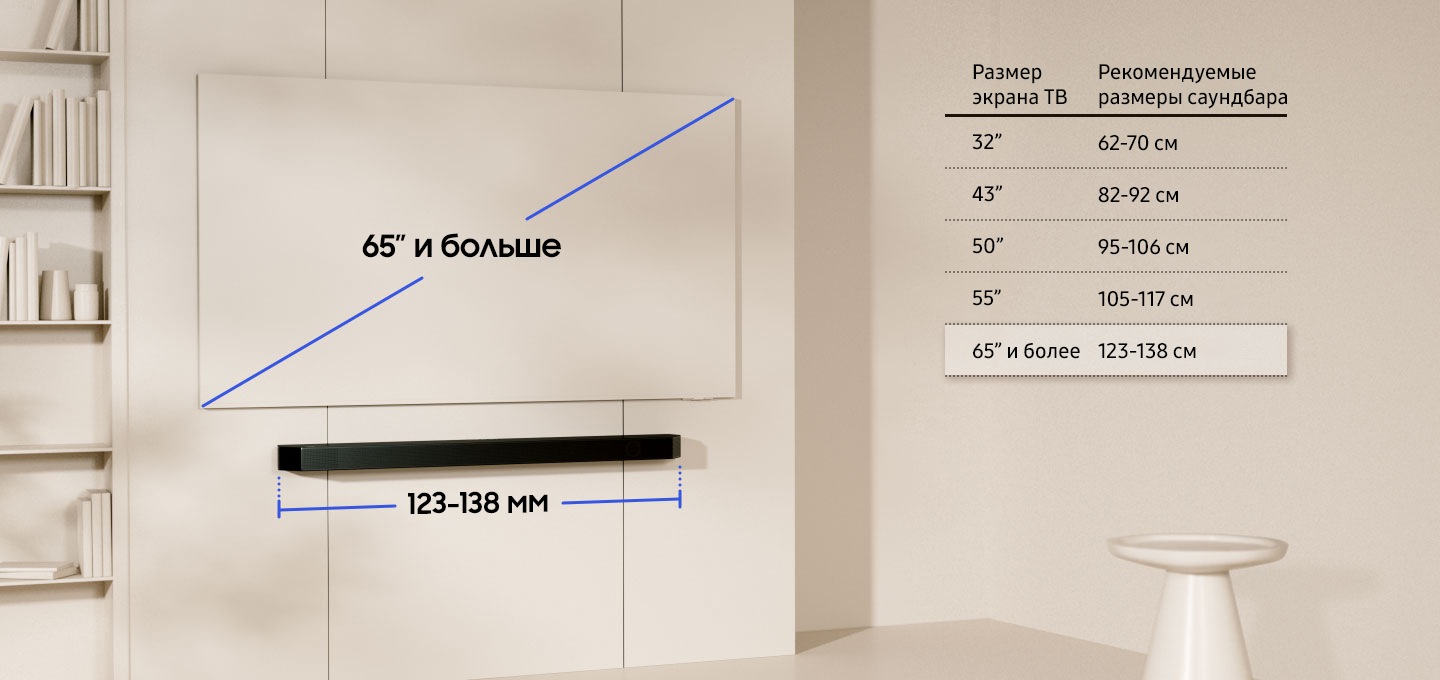 Прежде чем приступить к выбору телевизора, необходимо знать его длину, поскольку саундбар обычно располагается чуть ниже него. Вам нужен сбалансированный вид, поэтому саундбар должен быть либо такой же длины, либо чуть короче телевизора. Посмотрите наши рекомендации по сочетанию телевизора и саундбара ниже.