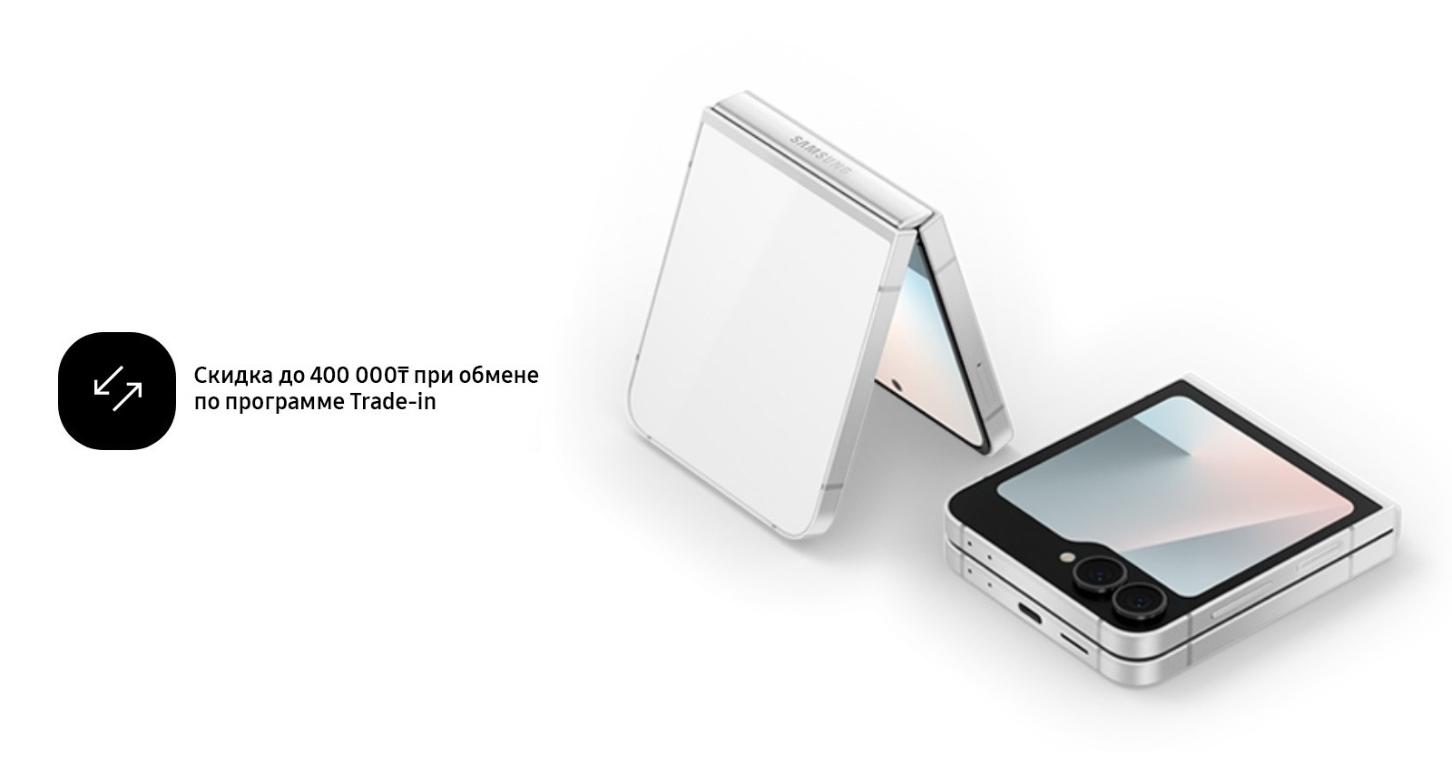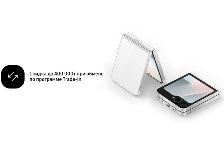 - *Расчет максимальной скидки Трейд-ин приведен в качестве примера исходя из оценочной стоимости б/у устройства Galaxy Z Flip6 при покупке нового Galaxy Z Flip7 FE c применением Трейд-ин. Стоимость скидки зависит от модели и ее состояния. Полные условия программы.