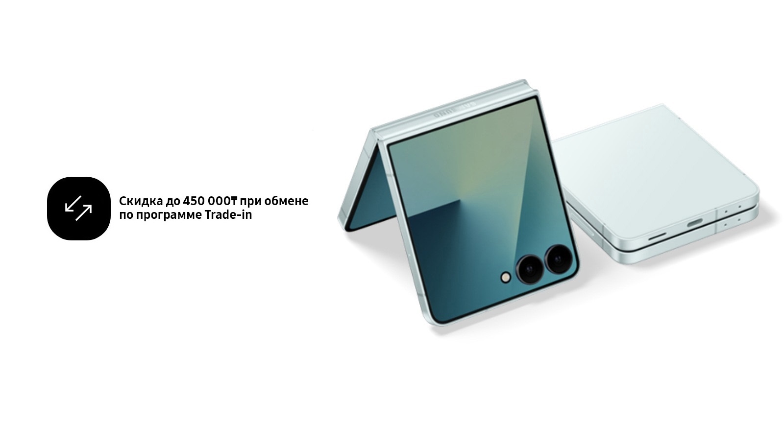 - *Расчет максимальной скидки Трейд-ин приведен в качестве примера исходя из оценочной стоимости б/у устройства Galaxy Z Flip6 при покупке нового Galaxy Z Flip7 c применением Трейд-ин. Стоимость скидки зависит от модели и ее состояния. Полные условия программы.