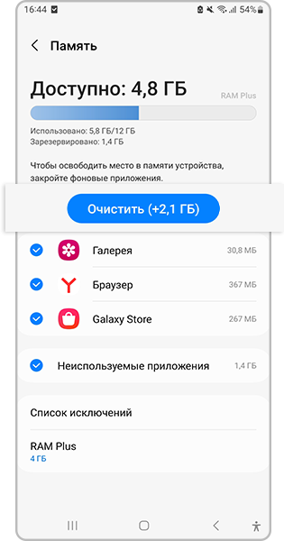 Если выбор объёма недоступен, при включении функции RAM Plus смартфон будет автоматически регулировать оптимальный объем виртуальной памяти, который необходим для эффективной работы.