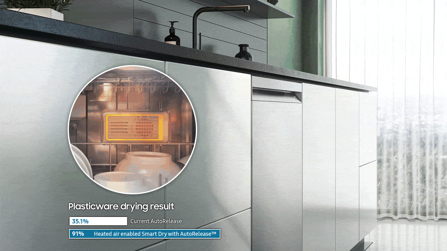 Seca los platos de manera eficaz* cada vez que uses Smart Dry con aire caliente a través de AutoRelease™. Absorbe la humedad y hace circular el aire a alta temperatura. También ajusta de forma inteligente la temperatura y el tiempo de secado para evitar el consumo excesivo de energía. Y, cuando finalizan los ciclos, la puerta se abre para un secado más rápido y eficiente.