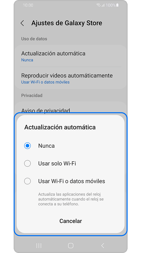 Puedes actualizar la configuración de su Galaxy Store para actualizar automáticamente las aplicaciones que descargaste de Galaxy Store. Sin embargo, algunas aplicaciones requieren actualizaciones manuales incluso si configuras actualizaciones automáticas. Además, las aplicaciones que descargaste de otra tienda de aplicaciones no se pueden actualizar automáticamente desde Galaxy Store.