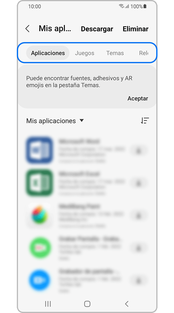 Puedes ver tu historial de compras/descargas desde el menú Galaxy Store. Debes iniciar sesión en Galaxy Store para poder ver tus aplicaciones descargadas.