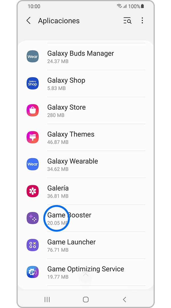 Nota: si Game Booster no aparece en la lista, ve a "Aplicaciones", selecciona el botón "Filtrar y ordenar" y activa "Mostrar aplicaciones del sistema".