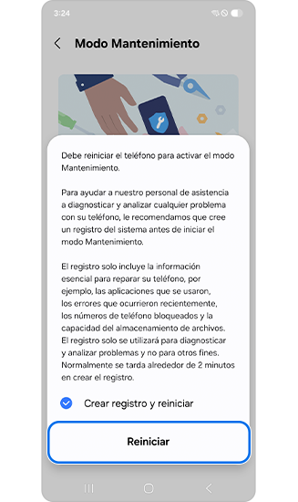 El Modo mantenimiento protege tu privacidad mientras otra persona usa tu teléfono, como cuando lo envías a reparar. Esta nueva función de privacidad bloquea el acceso a tus datos para que estés tranquilo mientras no dispongas del teléfono. En el Modo mantenimiento, no es posible acceder a la información personal (mensajes, imágenes y cuentas) y solo están disponibles las aplicaciones preinstaladas. Deberás desbloquear el teléfono para desactivar el Modo mantenimiento.