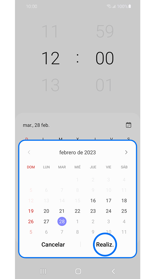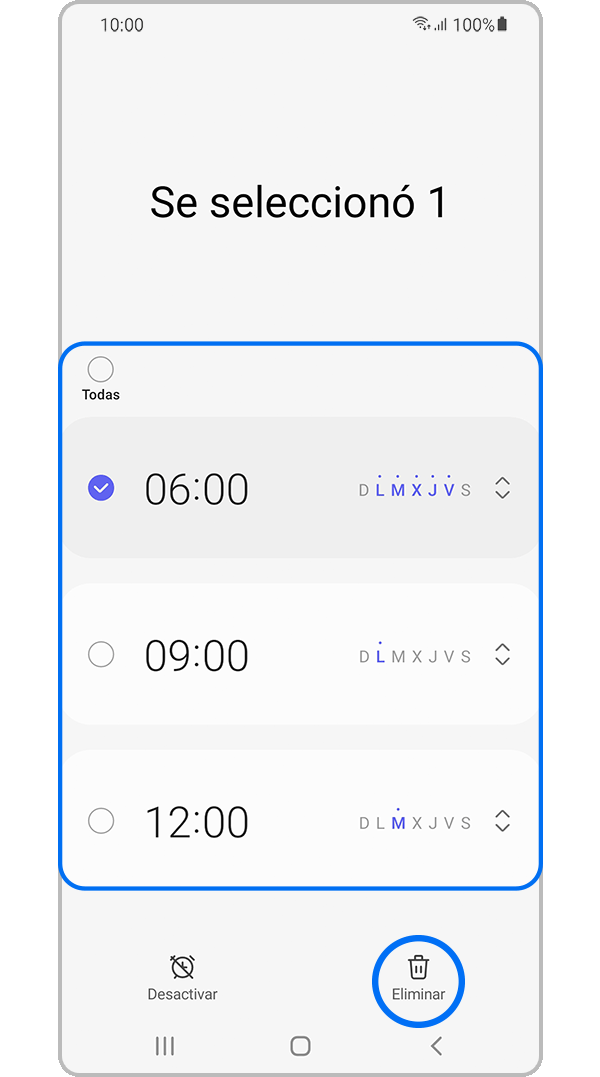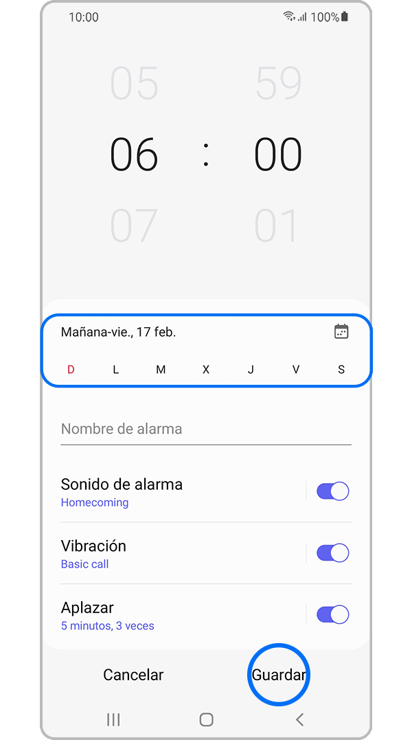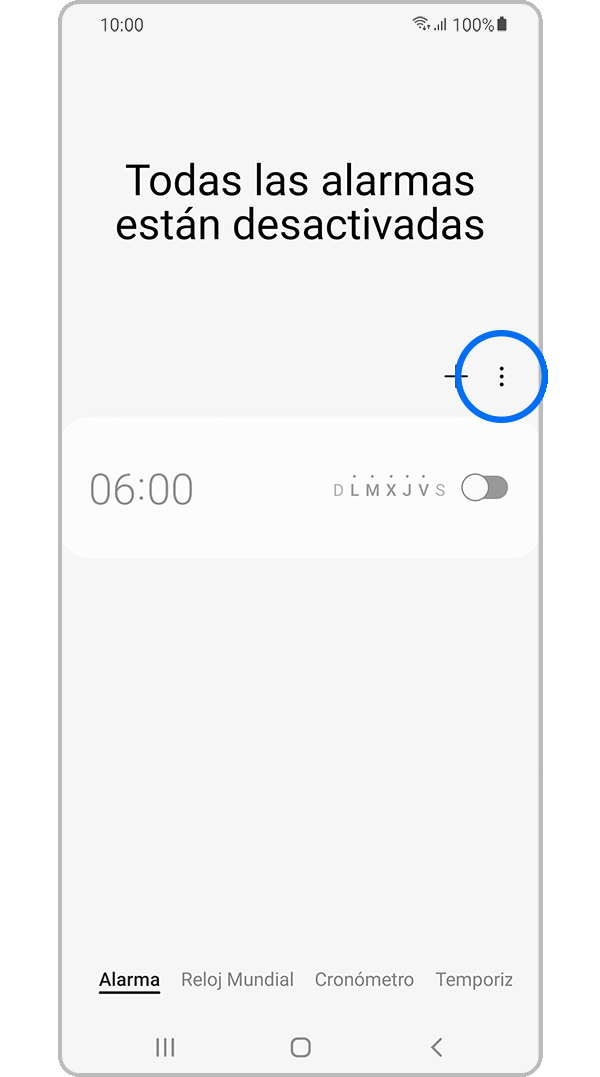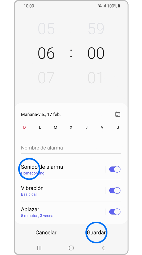 Nota: Una vez configurada la alarma, debes dejar el teléfono encendido para que suene a la hora configurada. Si el teléfono está apagado, la alarma no sonará.