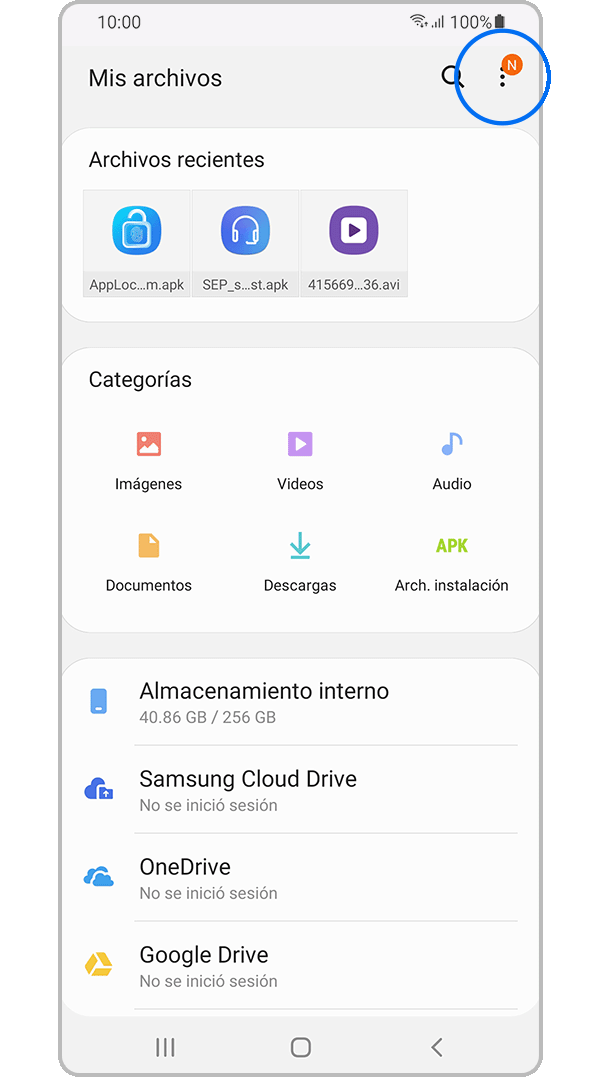 Los dispositivos Galaxy tienen la aplicación Mis Archivos para acceder y administrar archivos como documentos, imágenes, videos, archivos de audio y descargas. También puedes mover archivos a una tarjeta micro SD o un servicio en la nube si el dispositivo no tiene suficiente memoria interna.