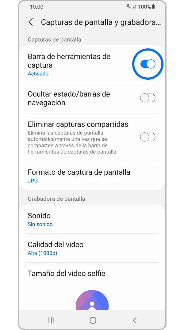 Puedes configurar opciones de captura de pantalla como la barra de herramientas y el formato de la captura. Para la grabadora de pantalla, puedes establecer el tamaño de los videos de Sonido, Calidad de video y Selfie.