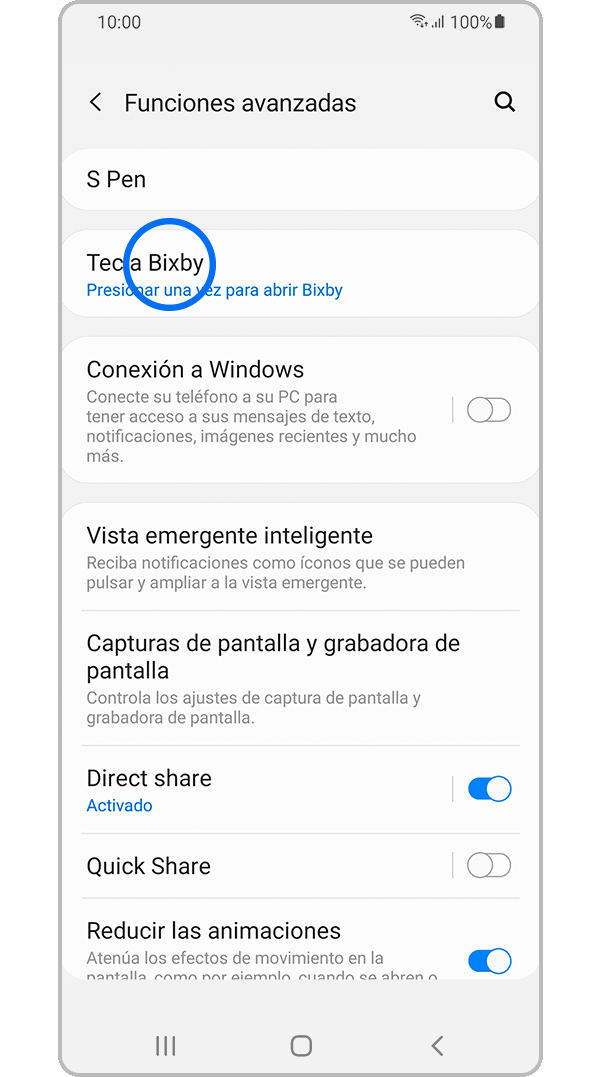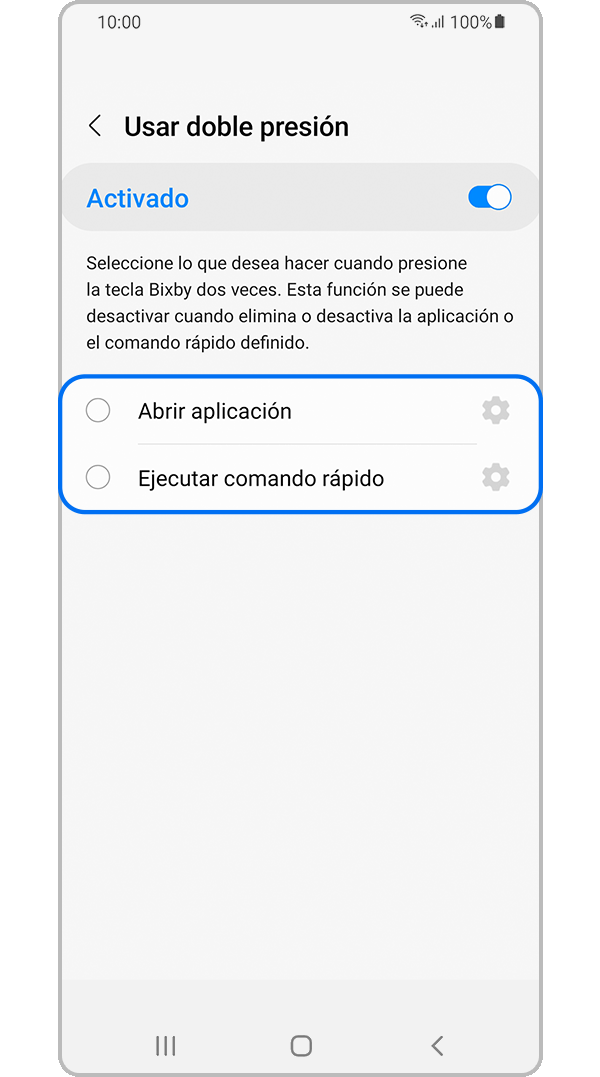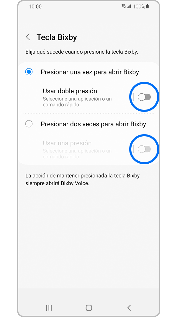 Nota: Actualmente no es posible deshabilitar la tecla Bixby. La opción más cercana posible es configurar Bixby para que se abra con una doble pulsación de la tecla Bixby, para que puedas usar una sola pulsación para activar tu aplicación o comando preferido.