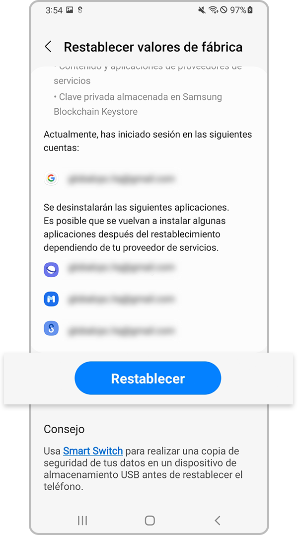 Advertencia: Al restablecer tu smartphone a valores de fábrica, los datos que tengas en tu dispositivo se eliminarán. Se recomienda realizar un respaldo de información antes de realizar este proceso. Si lo consideras necesario, puedes hacer este restablecimiento a valores de fábrica en algún centro de servicio Samsung.