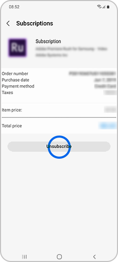 You can cancel a subscription from the Galaxy Store menu. You must be logged in to Galaxy Store in order to see your subscriptions. After you cancel a subscription, you can still use it until the service period ends.