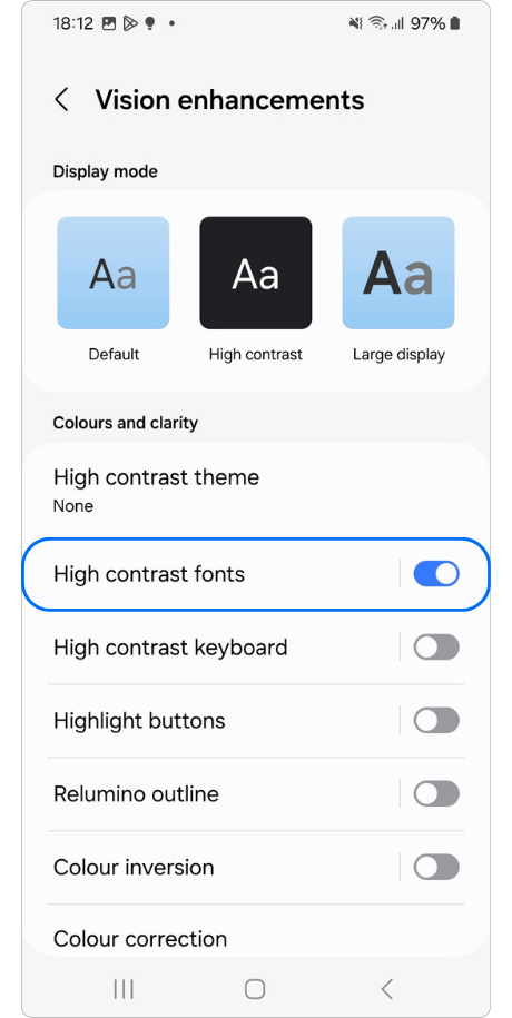 If you like your current font size and style but wish you could see it better, try turning on High contrast. This will add an outline to all fonts so that they stand out against the screen. To turn on High contrast, follow the steps below.