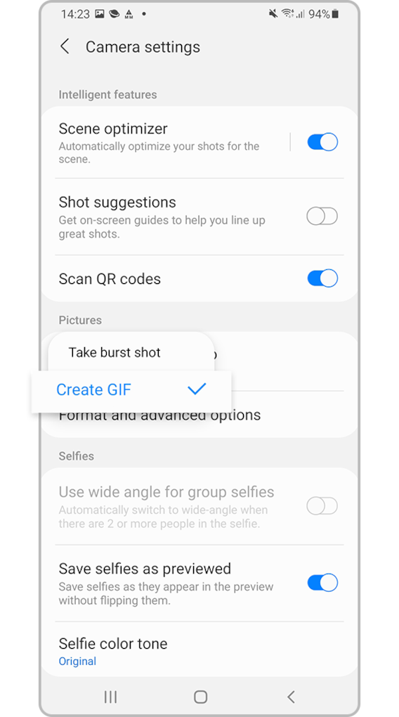 With simple camera settings you can create GIF images right from the Camera app. Take GIF images from your camera and view them in the Gallery app. Follow the steps below to change the camera settings.