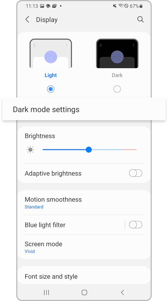 Dark mode allows you to reduce eye strain when using the device at night or in a dark place. You can also set a schedule for applying Dark mode. If Dark mode is enabled, follow the steps below to turn it off.