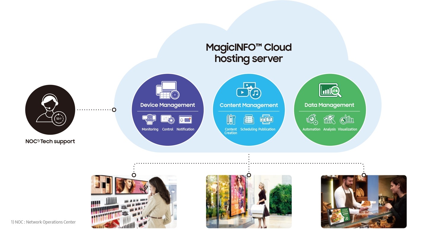 Building upon the success of the existing MagicINFO™ platform, the cloud-hosted and managed service provides customers with an easy, reliable and affordable web-based offering for the creation, scheduling and delivery of eye-catching content across digital signage networks. Enhanced by data-driven insights, MagicINFO™ Cloud gives businesses web-accessible control over a variety of displays, a single point platform to create and distribute content, manage and control your connected display end points and an optimized workflow to run seamless media from content creation, publishing through to device management.
