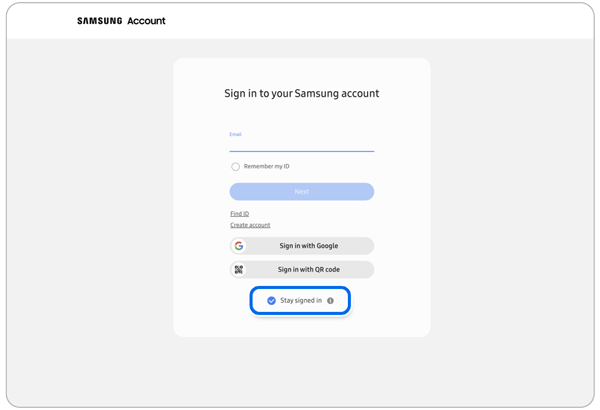 The option to "Stay signed in" is a convenient way to use Samsung.com. When you choose to stay signed in, you can access Samsung.com services and manage your account as soon as you open the website and avoid the extra step of having to enter your credentials each time you visit the site.