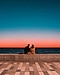 شخصان جالسان على جدار قرميدي يطل على المحيط وأمامهما مشهد الغروب الصارخ، حيث تظهر السماء بدرجات ألوان رائعة.