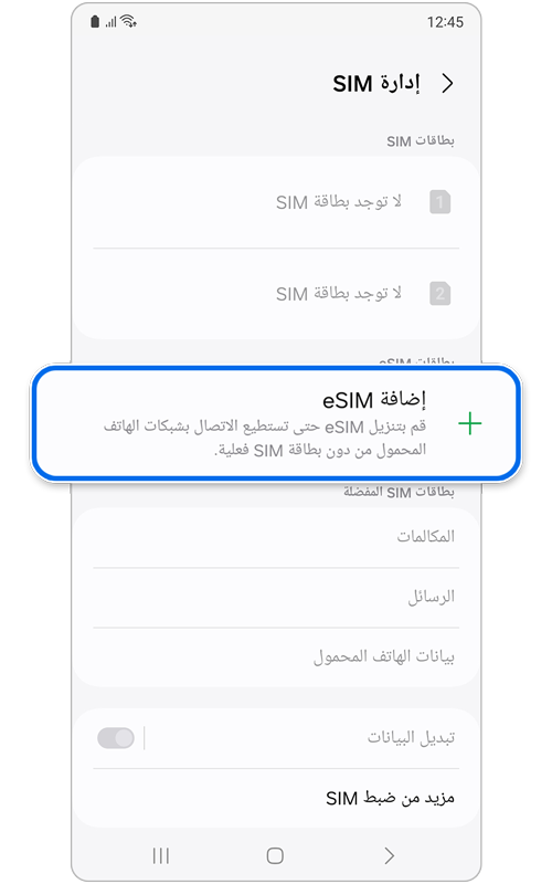 Galaxy eSIM (بطاقة SIM مضمَّنة) هي بطاقة SIM رقمية تتيح لك استخدام بيانات شبكة الجوّال من دون بطاقة SIM فعلية (بطاقة Mini SIM، وبطاقة Micro SIM، وبطاقة Nano SIM، وما إلى ذلك).
