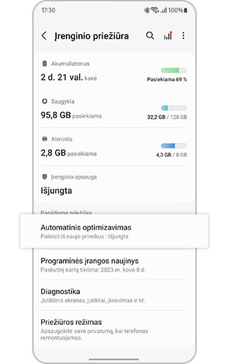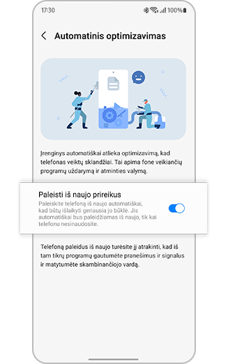 Ankstesnėse automatinio optimizavimo ir automatinio paleidimo iš naujo funkcijų versijose naudotojai turėjo rankiniu būdu nustatyti optimizavimo ir (arba) paleidimo iš naujo dieną ir laiką. To daryti nebereikia, nes telefonas pats atliks automatinį optimizavimą, kai to prireiks.