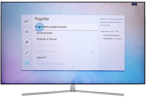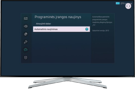 II variantas. Automatinis programinės įrangos atnaujinimas. Jei televizorius yra prijungtas prie interneto, televizoriaus programinė įranga gali būti atnaujinta automatiškai, kol žiūrite televizorių. Įdiegus naujinį, jis bus pritaikytas kitą kartą įjungus televizorių. Norėdami, kad televizorius atsinaujintu automatiškai, atlikite šiuos žingsnius.