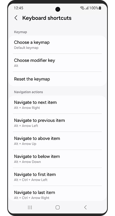 • Tastatūras saīsnesVari kontrolēt TalkBack ar tastatūras saīsņu taustiņiem, kad ir pievienota Bluetooth vai USB tastatūra.