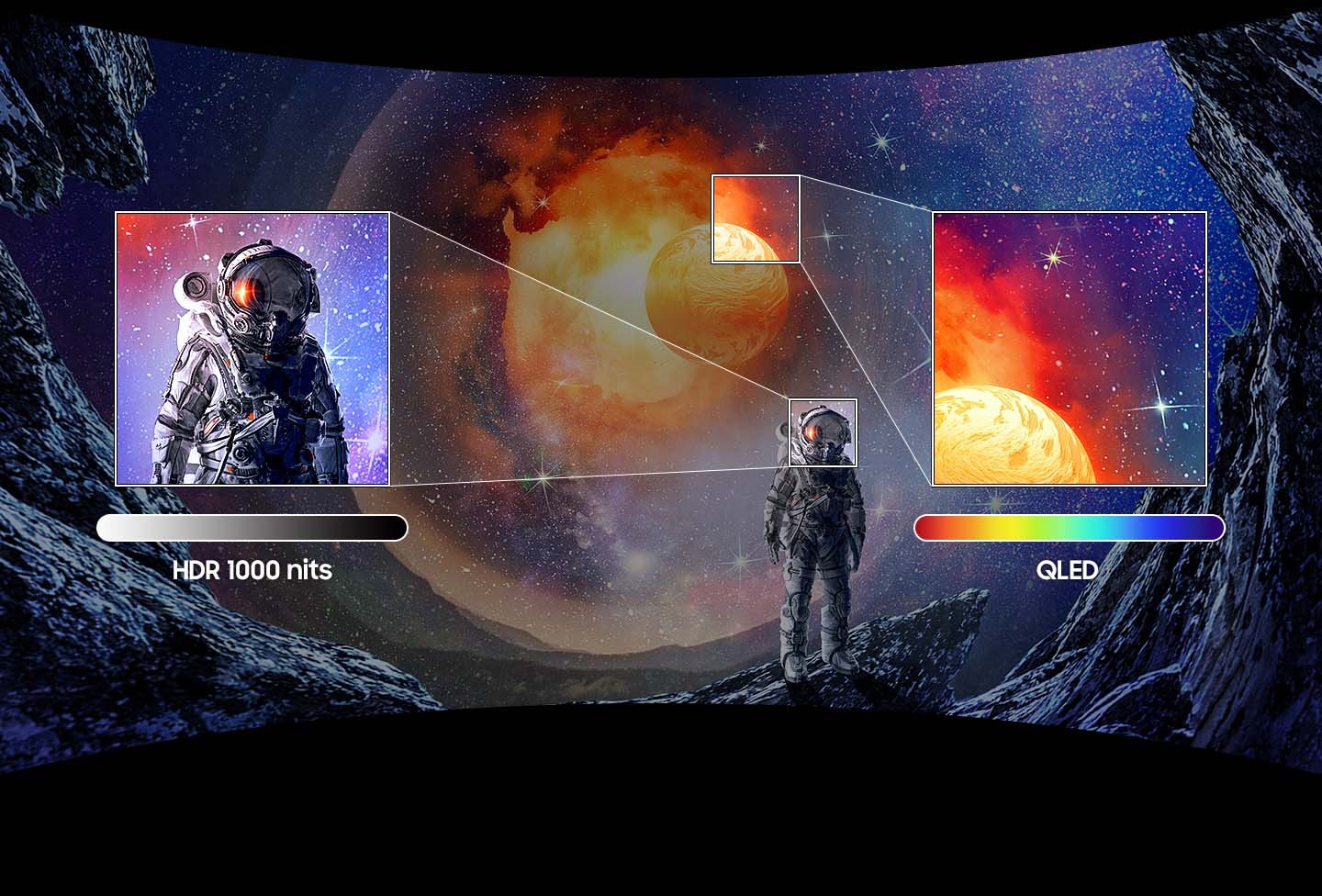 Piedzīvo teju reālas sajūtas ar HDR1000, kas atbalsta 1000 nitu lielu spilgtumu. Visbeidzot, atdzīvojas īsts augstā dinamiskā diapazona (HDR) saturs. Un pateicoties Samsung QLED tehnoloģijai DCI-P3 95%, visas krāsas tagad ir tīrākas, spožākas un satriecoši reālākas.