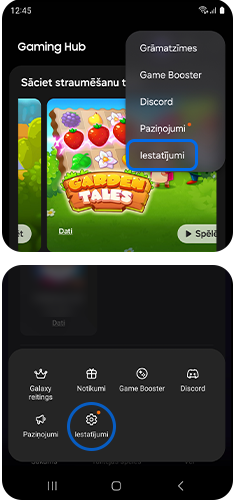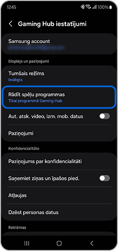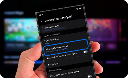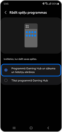 Piezīme. Ja izmantojat trešās puses sākuma ekrāna palaidēju, kas nav Samsung One UI Home, opcija "Rādīt spēļu programmas" nav redzama Gaming Hub iestatījumos. Šī funkcija darbojas tikai kopā ar One UI Home.